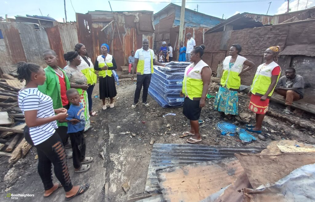 On 31st October 2024, a fire broke out in Bluebar in the Korogocho slums due to an electrical malfunction. Fortunately, no fatalities were reported. However, because none of their possessions could be saved, 15 households were rendered homeless due to the fire. In response to this catastrophe, Kenya Good Neighbors swiftly supported the affected families by donating mattresses and blankets to ensure they had the necessary bedding.